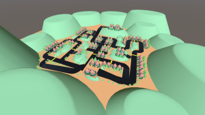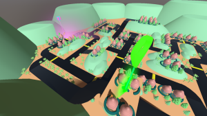 The green point is the destination while trying to avoid any failure of bumping into the surrounded trees and houses.